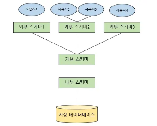 1) ์ธ๋ถ ์คํค๋ง(External Schema): ์ฌ์ฉ์์ ๊ด์ ์ผ๋ก, ๊ฐ ์ฌ์ฉ์๊ฐ ๋ณด๋ ๋ฐ์ดํฐ๋ฒ ์ด์ค์ ์คํค๋ง๋ฅผ ์ ์ํ๋ค.